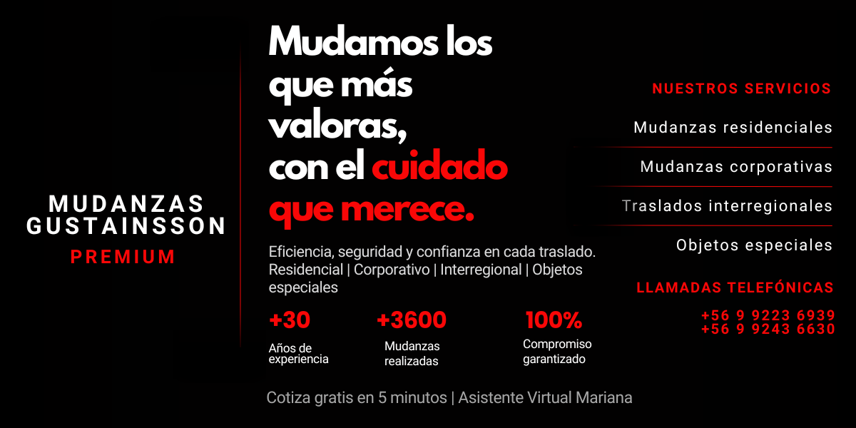 Publicado en Paulina cuevaTrustindex verifica que la fuente original de la reseña sea Google. Confien en su trabajo. Dos veces me ayudaron en la mudanza. Gracias al equipo de trabajo.Publicado en Alan wulliamozTrustindex verifica que la fuente original de la reseña sea Google. Buen servicio desde antes de la mudanza, buena coordinacion de detalles previos en origen y destino, asegurando puntualidad, eficiencia y eficacia del servicio. Atencion personalizada de Moises, personas respetuosas y cuidadosas con la manipulacion de los enseres. Recomiendo sus servicios.Publicado en Javiera pazTrustindex verifica que la fuente original de la reseña sea Google. Recomiendo totalmente el servicio de Mudanzas Gustainsson, ya he realizado 3 mudanzas con ellos y siempre me genera la misma tranquilidad y confianza en cuanto a su forma de trabajo, cuidado con mis cosas, responsabilidad, prolijidad, recomendaciones y sugerencias para con mis pertenencias. Excelente trato con Moisés, él y todo su equipo un 7. 100% recomendado.Publicado en Nicolás Arancibia SaldañoTrustindex verifica que la fuente original de la reseña sea Google. Servicio profesional. 100% recomendado.Publicado en Noe MontónTrustindex verifica que la fuente original de la reseña sea Google. En un momento de mi vida donde necesite confiar y ayuda con mi mudanza, encontré a Moisés y su empresa. Recomiendo enormemente su servicio, confíen que hacen todo bien y cumplen eficientemente. Gracias por tanto profesionalismo y seriedad. Mucho respeto y admiración. Saludos!Publicado en Rosy PerezTrustindex verifica que la fuente original de la reseña sea Google. Esta no es primera vez que ocupamos los servicios de Mudanzas Gustainsson, quedamos felices de ver como cuidan nuestros muebles, su excelente trato, disposición y siempre atentos a darnos soluciones a cualquier eventualidad, lo que siempre ha hecho que el mudarse sea una excelente experiencia para nosotros como familia. Los recomiendo 100%Publicado en Benjamin RiquelmeTrustindex verifica que la fuente original de la reseña sea Google. La verdad nada que decir, un servicio increíblemente bueno y pulcro, un servicio que se adapta a las necesidades del consumidor con un precio más que accesible, no puedo estar más a gusto con el servicio, en verdad eternamente agradecido con mudanzas Gustainsson, por su disponibilidad, disposición, por los consejos y por todo, 100% recomendablePublicado en Claudio riverosTrustindex verifica que la fuente original de la reseña sea Google. Excelente servicio de Moisés y su equipo: profesional, diligente y altamente confiablePublicado en Gonzalo MedinaTrustindex verifica que la fuente original de la reseña sea Google. Servicio de mudanzas excelente !!! La atención desde la primera consulta fue un 7, la atención de Don Moisés en el servicio desde principio a fin muy profesional. Muy recomendable!!!Publicado en Sergio Concha RiTrustindex verifica que la fuente original de la reseña sea Google. Eficiencia. Seriedad. Puntualidad. Excelente servicio.